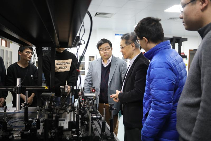 庄松林院士(右三)和詹其文教授(右四)在和学生们一起讨论。