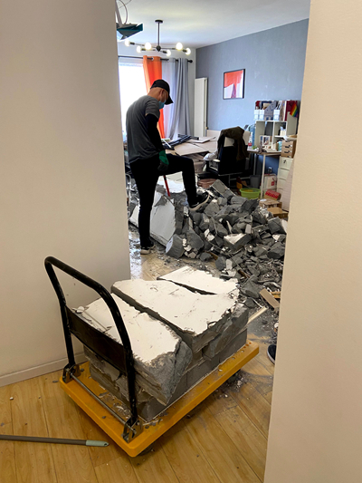过了一会,舍友给我发来照片。我房间的墙大体已经被砸掉了,边缘的钢筋悬着一些碎渣,水泥块堆了满地,覆盖住了白象牙色的木地板,我的床、桌椅和电钢琴落满了灰。