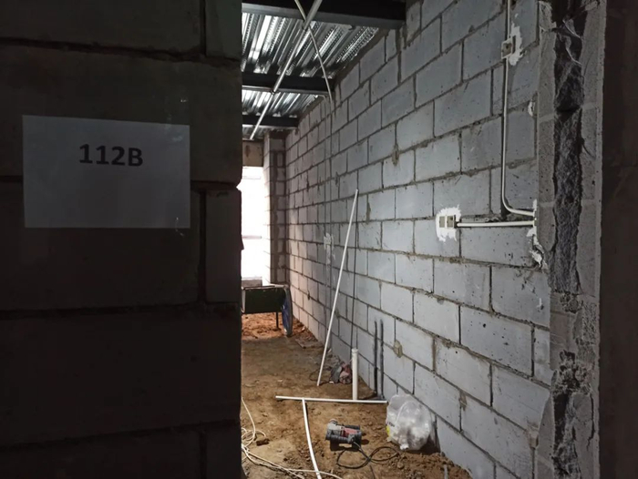 大楼内部却是另一派施工景象,工人们忙着运送泥沙和建材铺设。也许是为了方便销售,每个房间的房号已经早早地张贴出来,和这里粗犷原始的施工环境显得有些格格不入。