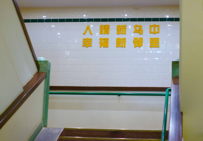 市集门口复古墨绿色的拱门和弧形窗、室内绿白相间的马赛克砖砌成的铺位,奶油色和木色的楼梯,大片采光玻璃窗和地面大理石,让整个大空间看起来明亮整洁。