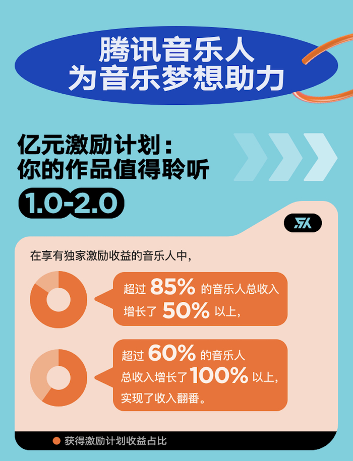 2020年,腾讯音乐人为解决收益“痛点”,将亿元激励计划再升级,为原创音乐人提供独家激励金,助力入驻音乐人实现收益增长。截止目前,在享有独家激励收益的音乐人中,超过85%的音乐人总收入增长了50%以上,超过60%的音乐人总收入增长100%以上,实现了收入翻番。据悉,亿元激励计划也会在近期进行升级,亿元激励计划3.0会面向词曲创作者开放,这意味着所有词曲创作者均可通过腾讯音乐人平台提升收入。同时,亿元激励计划3.0还会为词曲创作者带来收益激励、权益激励、流量激励三大优化升级激励举措,全方位加码音乐人收益。