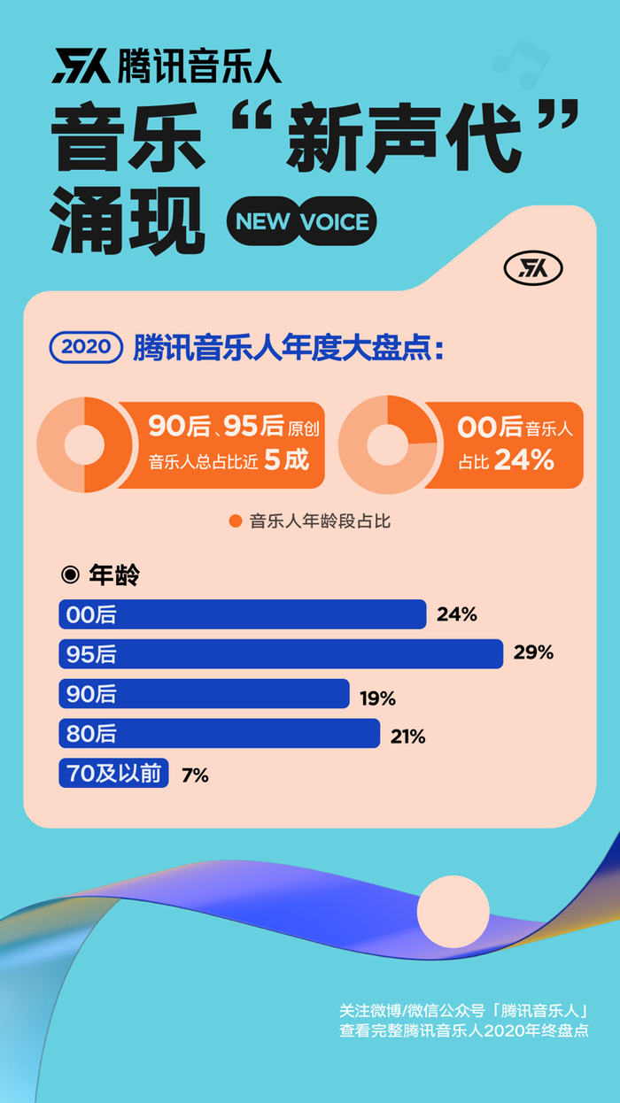 随着数字音乐平台成为了音乐人职业发展的主要阵地,各平台入驻的音乐人也日趋年轻化。据腾讯音乐人2020年度盘点数据显示,90后、95后及00后音乐人群体超7成,已成原创音乐创作主力军。值得注意的是,除了位居榜首占29%的95后,还在求学阶段的00后更是位列第二,占到了全平台音乐人的24%。