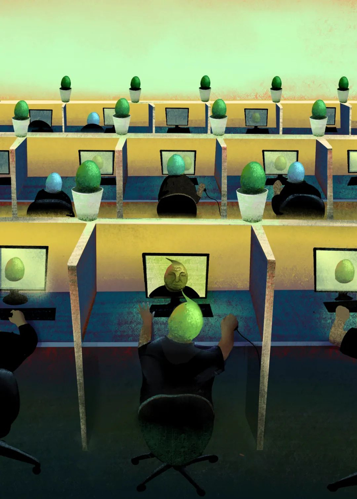 林立(化名)是放弃了继续深造进大厂的。他的工作是把“霸道总裁”之类的网络小说改编成一个短视频。这与他接受过的教育背道而驰:“好的内容应该是复杂的、深刻的,应该给用户很多的解释空间和诠释的权利。”作为职场菜鸟,林立也接收到很多的说服。总监说:“你做短视频的终点是什么?短视频的终点就是大户(能够左右行情控制市况的投资者)。”他自己也尝试说服自己:“要独立生存就要学会忍受,学会适应环境,学会适应社会,不要把道德感放得那么高,只要不犯法就行。”这些都没办法真正说服自己,撑了一年就辞了职。