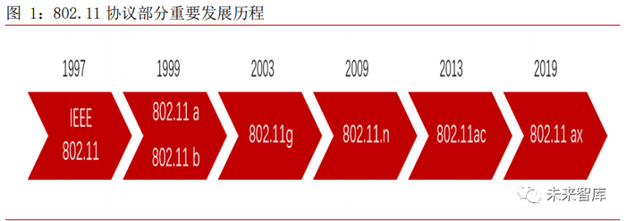 Wi-Fi 已历经二十余年发展。802.11 协议始于 20 世纪 90 年代,电气和电子工程师协会 (IEEE)在 90 年代初即成立相关工作组,专门研究和制定无线局域网的保准协议。随着 时间推移,802.11 协议有不同版本进行迭代以满足网络需求。