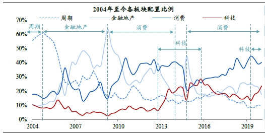 机构配置行为:2020年一季度,受疫情冲击,市场下跌,科技、消费板块配置比重分别从19.2%、39.1%增至23.7%、40.3%。
