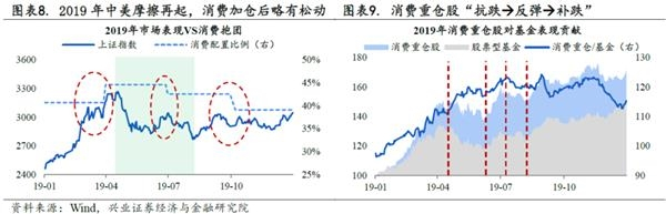 机构配置行为:2019年二季度,中美摩擦再起市场受挫,基金对消费板块加仓,配置比例从40.7%升至44.7%,仓位在冲击后期有所松动。
