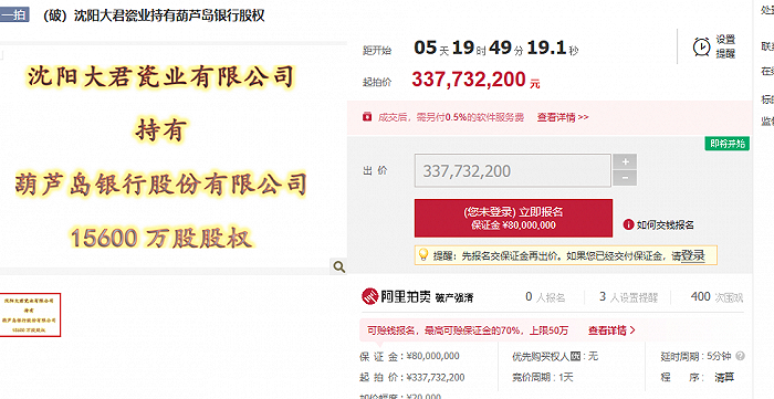 阿里司法拍卖显示,早在2018年1月和4月,大君瓷业持有葫芦岛银行的3960万股、3560万股被分别挂出拍卖,起拍价分别为7472万元人民币以及5340万元人民币,均流拍。其中一笔第二次拍卖折价8成后仍以流拍告终。