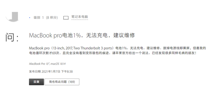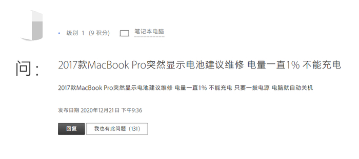 ▲多人反映2017款MacBook Pro出现无法充电的问题(来源:苹果官方社区)