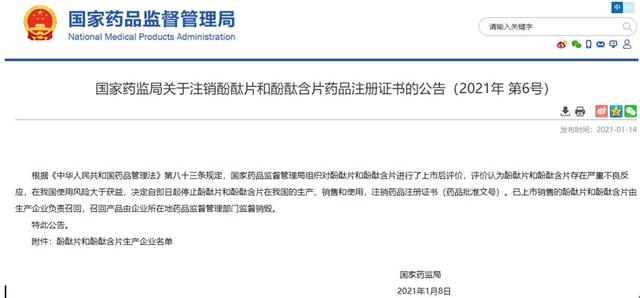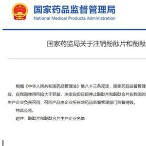 1月14日,国家药监局官网发布《关于注销酚酞片和酚酞含片药品注册证书的公告》:根据《中华人民共和国药品管理法》第八十三条规定,国家药品监督管理局组织对酚酞片和酚酞含片进行了上市后评价,评价认为酚酞片和酚酞含片存在严重不良反应,在我国使用风险大于获益,决定自即日起停止酚酞片和酚酞含片在我国的生产、销售和使用,注销药品注册证书(药品批准文号)。