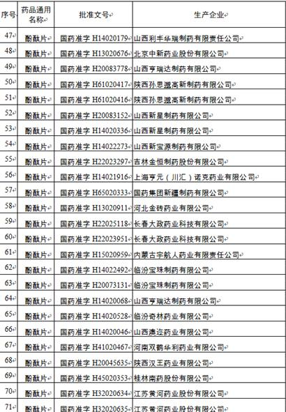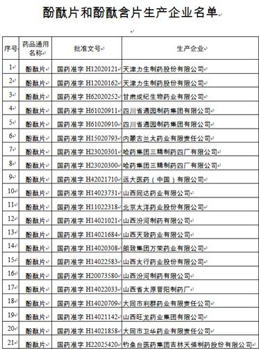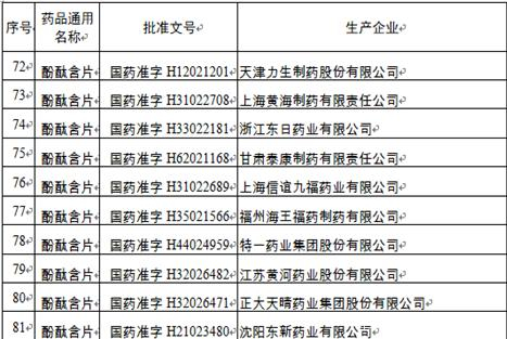 1月14日,国家药监局发布的公告附件中,《酚酞片和酚酞含片生产企业名单》显示,此类药共有81个批文,涉及厂家包括三精制药四厂、天津力生制药、山西亨瑞达制药、仁和堂药业等。