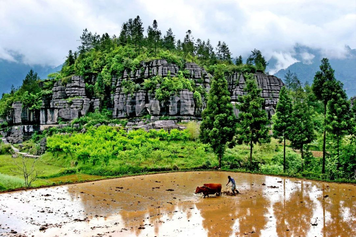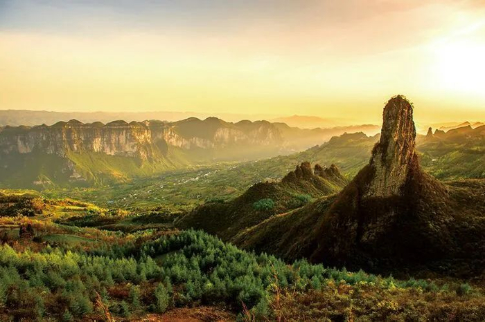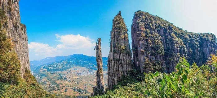 山,则危岩高耸,为石头的世界,不乏美丽石林。由于快速的地壳抬升加上河流的强烈侵蚀, 造成地表深向切割,引发地下水垂直运动,地表出现大量的峰丛洼地;垂直作用持续加强,使其岩体沿着垂直节理、裂隙迅速崩塌、风化形成大量石柱,从而石柱式峰林广为分布。