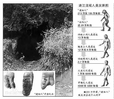 “建始人”,生活在距今215万至195万前,1969-2004年先后在建始县高坪镇麻札坪村“巨猿洞”中发现古人类牙齿化石、20多个种属哺乳动物化石(含巨猿)、大量骨器和石器。