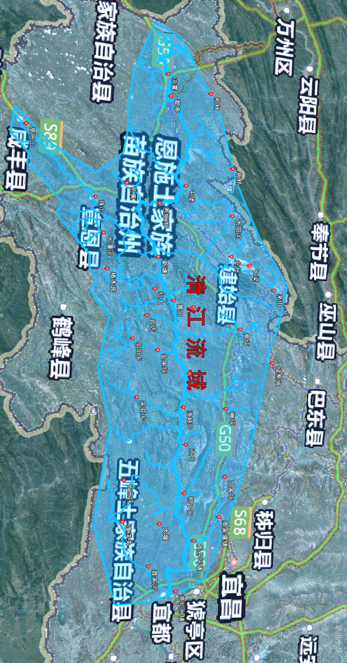 清江流域,处于中国第二级阶梯边缘,最高点五峰白溢寨海拔2320米,最低点红庙岭仅66米,由于其北部是大巴山山脉的南缘分支—巫山山脉,东南部和中部是苗岭的分支—武陵山脉,西部是大娄山山脉的北部延伸部分—齐跃山脉,其独特的地形地貌造就清江流域成为国内最具典型性的区域性河流之一。