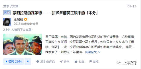 1月13日,花名为Leadroyal的前拼多多员工表布长文《我在拼多多的三年》,描述其在拼多多上市前后三年间的见闻,指出拼多多诸多不合理的机制,包括卡点进食、跨年夜值班、因100元优惠券事件引发的技术全员7*24值班等,剑指拼多多的“集中营式管理”,斥责其将员工视为“人肉干电池”的冷漠。