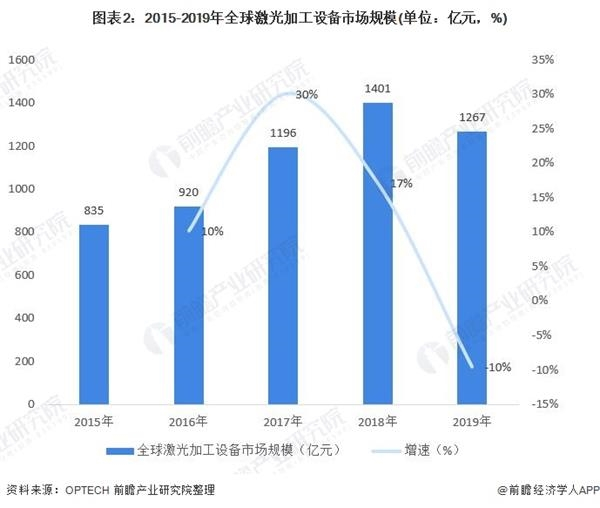 全球激光加工设备市场规模超过千亿元,2019年达到1267亿元,同比下降10%。