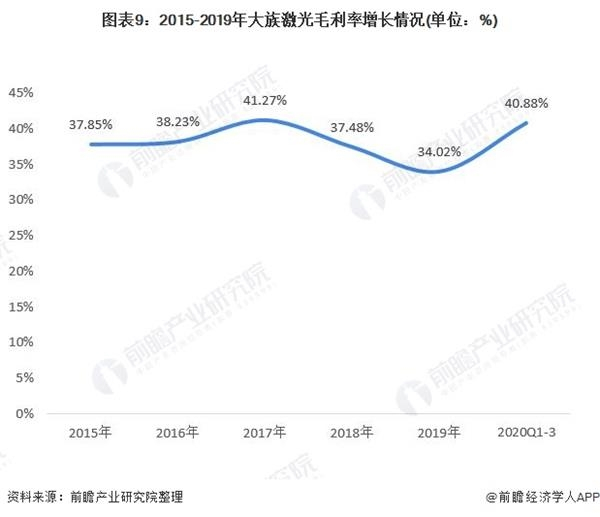 2015-2019年大族激光毛利率整体在35%以上水平,2019年略有下降,主要是受产品销售结构及市场竞争加剧的影响,导致公司综合毛利率较2018年度下降约3.46个百分点;但是2020年前三季度上升为40.88%。