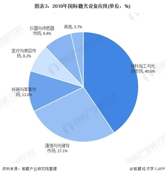 国际激光设备应用较为多元化,包括材料加工与光刻市场、通信与光储存市场、科研与军事市场、医疗与美容市场、仪器与传感器市场等,其中,材料加工与光刻市场占比最高,达40.6%;其次为通信与光储存市场,占比为27.1%。