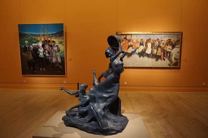 中国美术馆称,这是一个“举全馆之力,淘尽家底”的展览,澎湃新闻记者在现场看到,600多件展品覆盖中国美术馆全部展厅,在进门处巨大的红色灯罩笼罩着一件奋力向前的“开荒牛”雕塑。