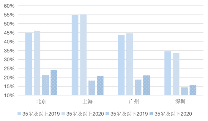 家庭流动性低阻碍了异地再就业。2020年2-9月,中高龄求职者投递简历的岗位中,北上广深四个一线城市招聘需求的同期增速,比非一线城市的增速低了21个百分点,中高龄求职者在一线城市实现再就业的机会低于其他城市。与此同时,中高龄求职者已在本地建立起稳定的家庭关系和成熟的社会网络,比如拥有北上广深本地户口的中高龄求职者比重(45.4%)明显高于35岁以下求职者(20.6%)。即便其他城市的人才需求缺口更大,中高龄求职者携家带口流动到其他城市就业的意愿较低,这也是中高龄求职者再就业压力较大的一个重要因素。