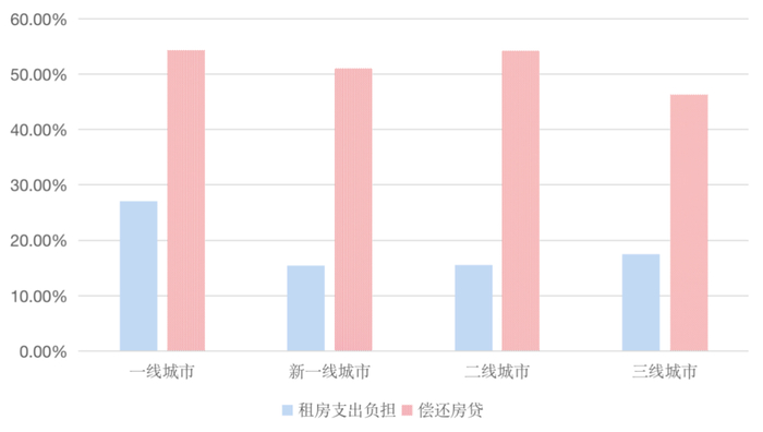 存在区域性的银行按揭贷款风险隐忧。问卷调查显示,72.4%的中高龄求职者家庭有偿还按揭贷款的压力,其中21.2%的家庭月房贷支出在5000元至1万元,10.1%的家庭每月还款额在1万元以上。一线城市中高龄求职者将偿还房贷列为前三大支出的比重最高(54.3%),且房贷支出在5000元以上的家庭比例为36.7%。即使是二线城市,将房贷作为家庭前三大支出的比重也达到54.25%。