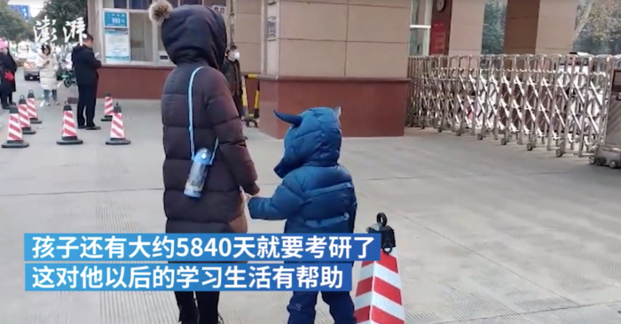 去年考研期间,济南一位妈妈把5岁的孩子带到考研点外,让孩子提前体验考场氛围。