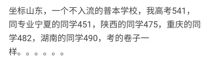 同样的试卷,山东学生要比其他大部分省的学生多考几十分,才能踏入同一个学校。