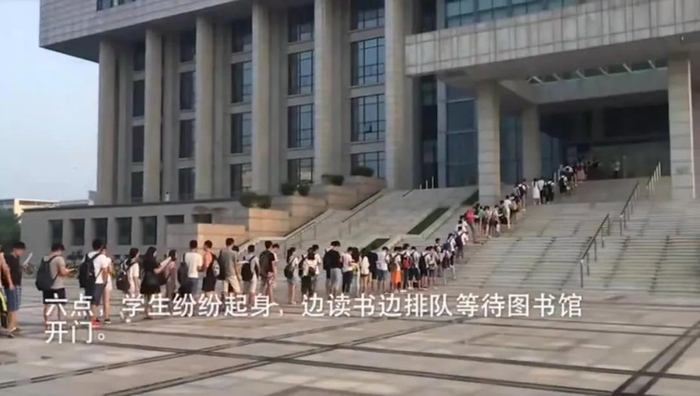 凌晨5:00,图书馆门前的台阶上,从上到下,坐了一排等待开门的学生。