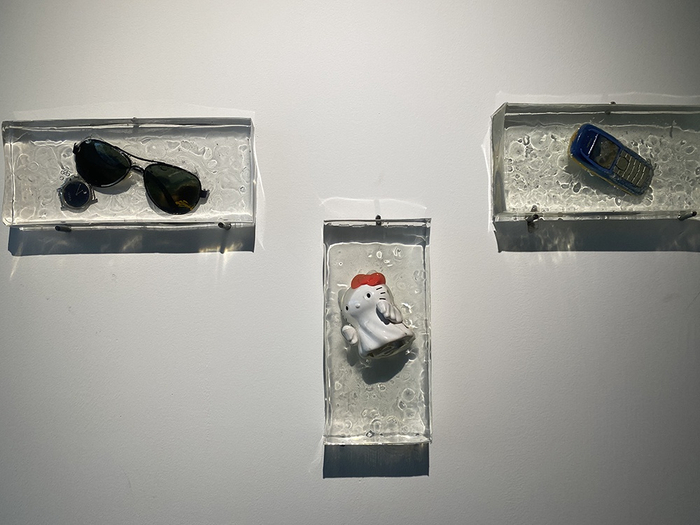 “鬼城”里会碰到很多物件,鞋子、毛巾、小灵通,以前的墨镜,还有布娃娃,这些可能是农民工用过的一些物件。他们曾在这里建了好几年的房子,还带了老婆孩子来到这边,最后也不能留下来,人走了,只留下很多生活的痕迹。我们把他们的衣服鞋子之类的捡回来,给这些物件覆盖上水泥或者胶水,用雕塑的形式把它们再呈现出来。