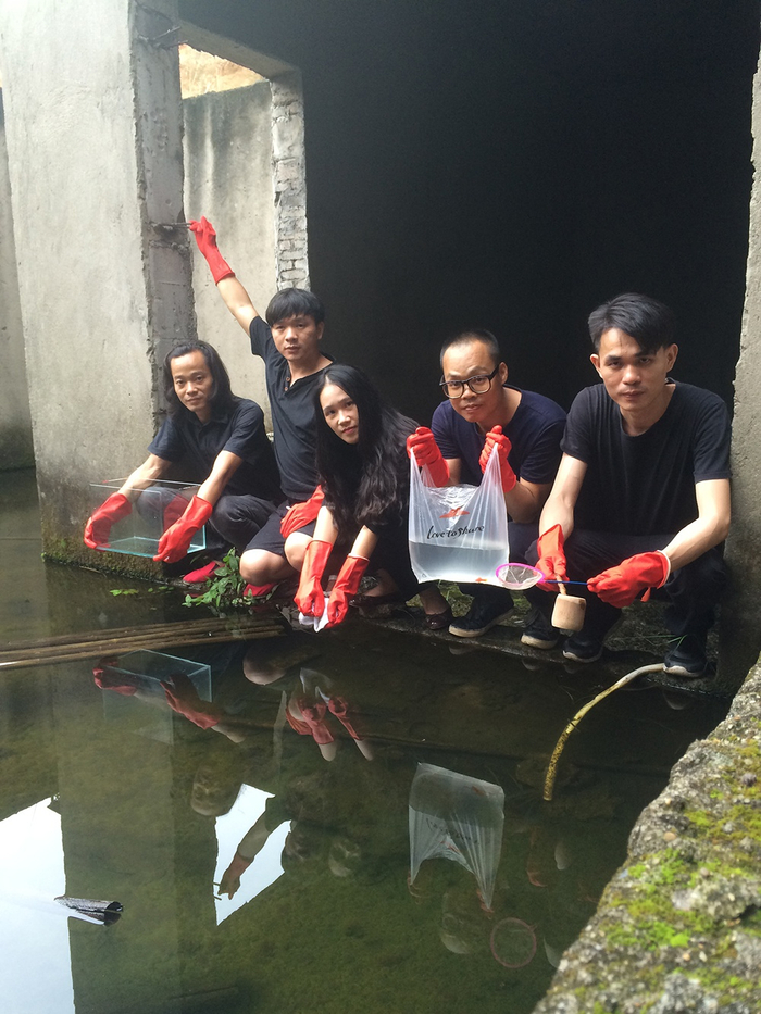 这条金鱼其实就像我们一样。我们从乡下到镇里读书,然后到一个地方工作、结婚、生子,地方换来换去,人折腾来折腾去,就这样过了一辈子,老了,也就回到了大自然。后来我们回去找过这条金鱼,它不见了。 行为艺术:养金鱼  二打六供图