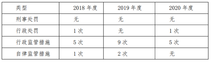 近三年受到刑事处罚、行政处罚、行政监管措施和自律监管措施的概况:行政处罚 2 次,行政监管措施 19 次,自律监管措施 3 次。具体如下: