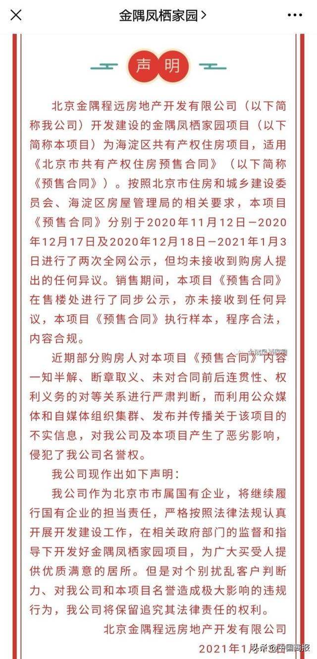 对于购房者的诉求,1月13日,该项目的开发商北京金隅程远房地产开发有限公司在微信公众号发表声明进行回应,表示已按照相关政策要求将项目预售合同进行过两次全网公示,未接收到购房人提出的任何异议。认为该项目预售合同执行样本程序合法,内容合规。开发商还在声明中指出,部分购房人存在对预售合同内容一知半解、断章取义等情况。