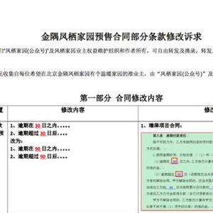 引发争议的条款不止上述一项,从购房者们建立的微信公众号“凤栖家园”中,记者获得了一份《金隅凤栖家园预售合同部分条款修改诉求》,里面详细罗列出18项诉求修改的内容、修改依据以及其他共有产权房合同的参考案例。其中多条涉及因甲方出现违约而致使乙方选择退房的,均约定为甲方无息退款给购房者,而不必给付房款利息。此类规定使购房者感到不满。