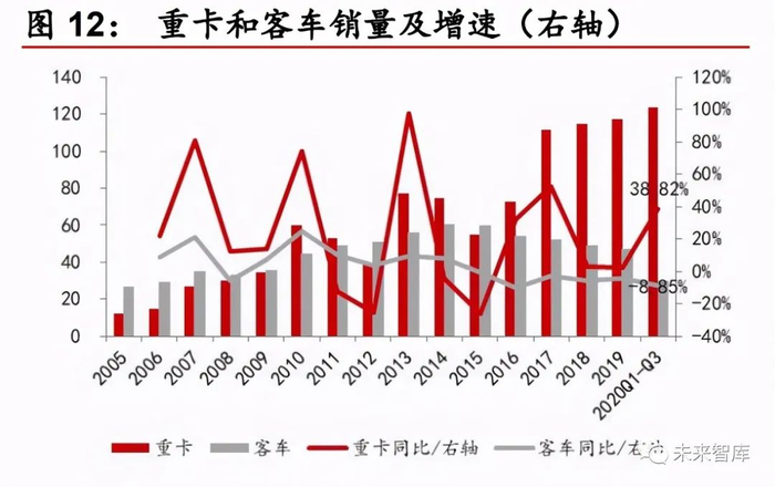 商用车逆势增长,景气度前所未有。截至 2020 年 10 月,全国共实现商用车销 量 420 万辆,同比增长 20.92%,在整个汽车市场销量下滑的情况下实现逆势 增长。货车是商用车增长的主要推动力。由于国三存量重卡的逐步淘汰以及地 方专项债对基建的支持,国内重卡销量维持高位,前三季度全国共实现重卡销 量 123 万辆,同比增长 38.82%,其中 9 月份同比增长 80.20%。自今年 7 月全 国多个地区开始实施针对重型商用车的“国六”排放标准后,国家相关排放标 准在未来还将进一步提高,预计未来重卡销量将继续维持高位。
