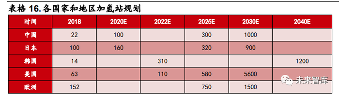 各国规划完备,未来发展可期。日本在政策上将氢能上升为国家战略,规划 2030 年保有 80 万辆燃料电池汽车,加氢站达到 900 座;美国 2002 年便已规 划国家氢能路线,规划到 2030 年保有 530 万辆燃料电池汽车,加氢站达到 5600 座;韩国 2019 年发布《氢能经济发展路线》,规划到 2040 年,燃料电池累计 产量达 620 万辆,建成加氢站 1200 座;欧洲在 2019 年发布《欧洲氢能路线 图:欧洲能源转型的可持续发展路径》,规划到 2030 年燃料电池乘用车达 370 万辆,燃料电池商用车 50 万辆,燃料电池卡车和公交车 4.5 万辆,使用燃料 电池火车可替代约 570 列柴油火车;中国规划到 2035 年燃料电池汽车保有量 达 100 万辆,2030 年加氢站 1000 座。