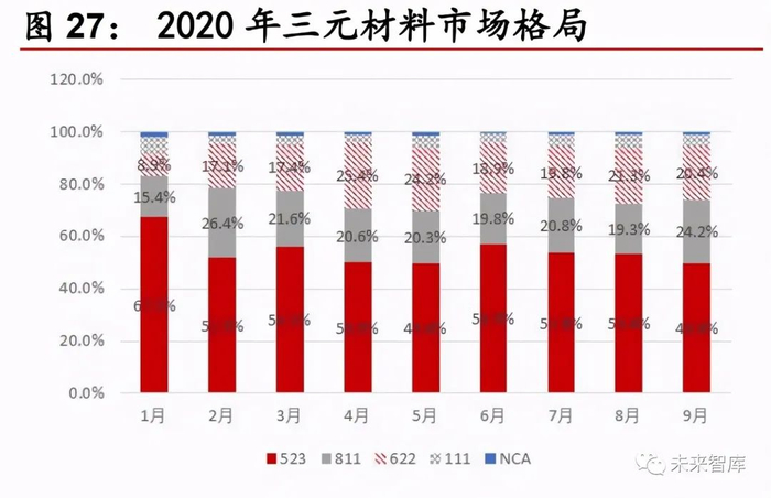 低镍到高镍的技术趋势明确。从能量密度来看,高镍 811 能量密度超过常规 523 大约 40%,对应整车续航里程大幅提升,而 523 在能量密度方面与铁锂 并无明显差距,因此未来市场空间将会受到挤压。从成本来看,三元电池中钴 和锂占据绝大部分成本,高镍 811 中钴用量减少 58%,锂和碳酸锂用量均减 少 15%,具有成本优势。高镍 811 和 622 在三元材料中的市占率分别从年初 的 15.4%和 8.9 提升至 9 月份的 24.2%和 20.4%,终端市场景气,高镍化趋 势明显。