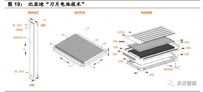1)电池单体结构改善,提升铁锂电芯能量密度。在磷酸铁锂电池发展初期,10~20Ah 的电池单体是市场主流,之后企业逐步将电芯单体扩大,节约辅材的 消耗,既能降低成本,也能提升能量密度,单体容量很多超过 200Ah。另一方 面,近期比亚迪的刀片电池是基于电池结构优化的实例。刀片电池即长电芯方 案(主要指方形铝壳),是一种通过增大电芯的长度(最大长度与电池包宽度 相当),将电芯扁长化设计,来进一步改进电池包集成效率的技术。比亚迪刀 片电池“体积比能量密度”比传统铁锂电池提升了 50%,成本能下降 20%-30%, 放电倍率将大幅提升,寿命长达 8 年 120 万公里。搭载同样重量和体积的电池 在拥有更长的续航的同时,也保留了磷酸铁锂电池寿命长,安全性高的特点。