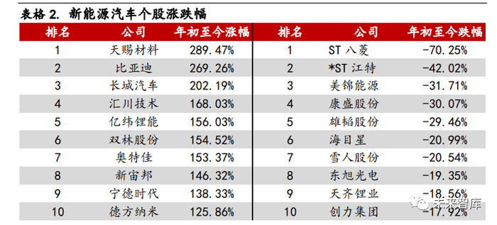 新能源汽车产业链受到持续追捧。随着国内复工复产的稳步推进,市场需求增 加,行业回暖,锂电池和新能源汽车行业逐渐向好发展。年初至今,新能源汽 车指数和锂电池指数分别上涨 40.70%和 36.72%,由于新能源汽车指数中包括 了相对更多的新能源整车企业,表现强于锂电池指数。今年以来,国家和地方 政策齐加码,国家层面平缓补贴退坡力度,2020 年补贴政策落地、《新能源汽 车产业发展规划(2021-2035 年)》出台、地方层面免征购置税等因素均促进 了新能源汽车的发展。此外,特斯拉于 5 月和 10 月两次大幅下调 Model 3 售 价,刺激了市场购买需求,6 月特斯拉美股股价创历史新高,正式超越丰田成 为全球市值最大的车企。作为新能源汽车的领头企业,特斯拉年内最高涨幅高 达 408.92%,带动了全球新能源汽车的发展,而国内新能源汽车领跑企业比亚 迪的年内最高涨幅也超过 300%,市场情绪高涨,从而促使今年的新能源汽车指 数跑赢锂电池指数。