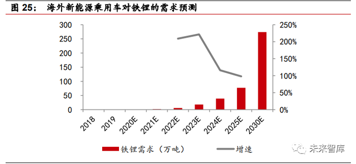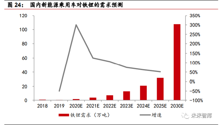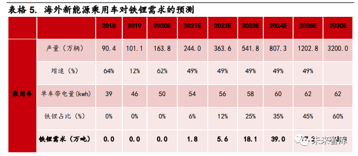 乘用车将成为铁锂需求主力。今年以来,比亚迪发布“刀片电池技术”、特斯 拉的 CTP 技术、大众与国轩高科深度合作,均表明了主流车企正重新选择磷酸 铁锂电池作为新能源汽车的动力电池。11 月 16 日,滴滴在北京正式发布了专 门为共享出行场景设计的车型 D1,滴滴 D1 是与比亚迪合作的搭载磷酸铁锂电 池的车型,得益于磷酸铁锂的长循环寿命,使用比亚迪“刀片电池”的滴滴 D1 相较于传统燃油车,将会有更长的生命周期和总使用里程。可以预见的是,未来网约车电动化是大势所趋,而磷酸铁锂电池也将成为主流选择。今年国内新 能源乘用车受疫情影响,预计产量为 100 万辆,之后依照工信部 2025 年规划, 达到约 480 万辆,对应 CAGR 为 37%,2030 年预估产量达到 1300 万辆。2019 年国内新能源乘用车中铁锂占比仅为 5%,随着比亚迪、特斯拉、大众等 主流车企选择搭载磷酸铁锂电池,预计到 2030 年,搭载磷酸铁锂的新能源乘 用车占比将达到 60%,随着磷酸铁锂渗透率的不断提升,预计 2025 年新能源 乘用车对铁锂的需求将达到 2019 年的近 80 倍。乘用车对铁锂需求的贡献度 将从 2019 年的 7%提升至 2030 年的 77%,成为铁锂需求的主力。