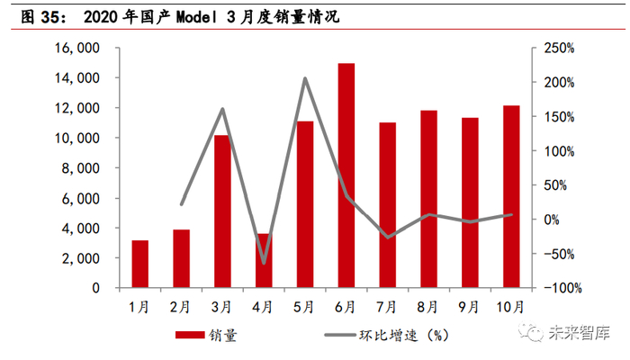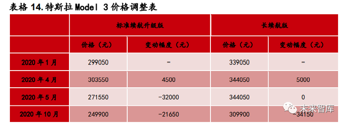Model 3 平价化,带动销量快速增加。5 月 1 日,特斯拉 Model 3 标准续航升 级版价格由 30.355 万元下调至 27.155 万元。5 月以来,特斯拉上海临港工厂 复工复产状况良好,单月产量保持 1 万辆/月以上的水平。从需求端看,特斯 拉在中国需求旺盛,3 月 Model 3 销量达到 10160 辆,虽然 4 月曾经历销量大 跌,仅完成 3635 辆的销量,但是在 5 月降价后,Model 3 重夺新能源汽车销 量冠军,5-10 月销量均保持在 1.1 万辆以上。10 月,特斯拉再度降价,Model 3 售价下调至 24.99 万元,进入 25 万区间,预计随着特斯拉相关产业链国产 替代进程加速,特斯拉将继续降价,进入 20 万区间。特斯拉降价使得新能源 汽车在成本端的优势越发明显,行业领跑者特斯拉价格降低也将促使行业其他 车企降价以扩大销量。