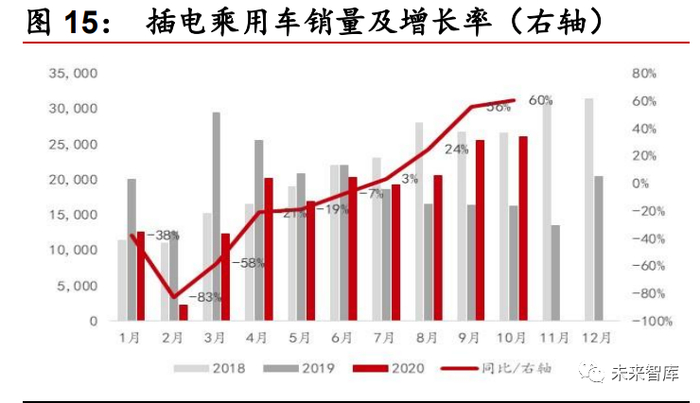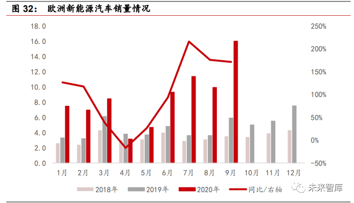 欧洲新能源汽车销量高速增长,全年销量有望超 110 万辆。2020 年欧盟进入 CO2排放新规考察期,各国政府也纷纷加大新能源汽车支持力度。2020 年 Q1 欧 洲地区新能源汽车销量增速迅猛,1 月、2 月、3 月分别完成销量 7.5 万辆、 7.0 万辆、8.4 万辆,同比增速分别为 126%、117%、38%。进入二季度,受欧洲 疫情扩散影响,4 月份新能源汽车销量受阻,欧洲汽车销量下滑 17%,但表现 依然好于燃油车。三季度欧洲新能源汽车再次爆发式增长,7-9 月每个月销量 同比增长均大于 170%,且 9 月份欧洲市场售出的新能源汽车数量首次超过柴 油车。今年 1-9 月欧洲累计销售新能源乘用车汽车超 77 万辆,超越中国成为 全球第一大新能源汽车市场,预计欧洲今年全年销量有望超 110 万辆,新能源 汽车市场景气度高涨。