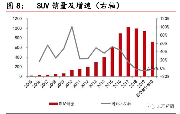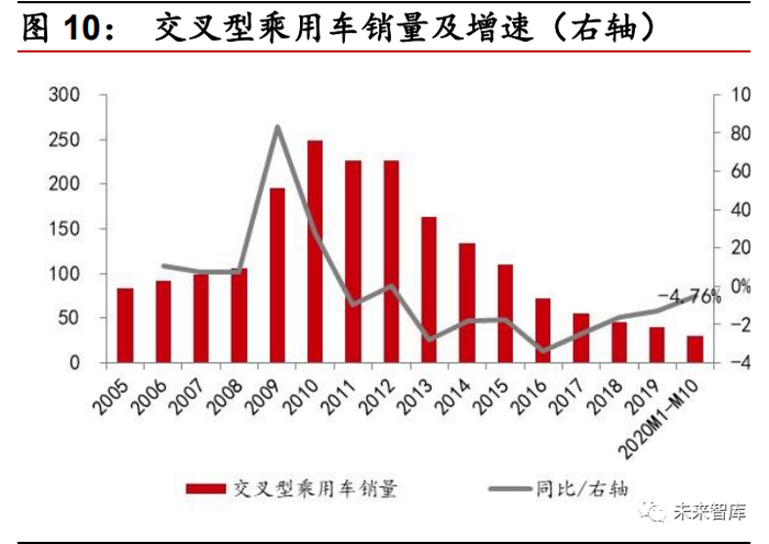 乘用车整体表现不佳,SUV 相对坚挺。截至 10 月,轿车、SUV、MPV、交叉 型乘用车的销量同比增速分别为-13.68%、-2.97%、-29.55%、-4.76%。一季 度受疫情影响,所有车型销量均出现较大下滑,5 月份以来销量回暖,但与去 年相比依旧有不小的差距。其中,SUV 的表现在各类车型中相对坚挺,市场份 额依然延续了多年来的上升态势,而 MPV 的下滑趋势依旧存在,其原因是 7 座 SUV 不断出现爆款,挤压了一定需求,同时 MPV 对经济环境较为敏感。
