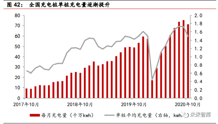 单桩平均充电量逐渐提升。2019 年全国公用充电桩共计充电 51.6 亿度,同比 增长 115%,同期公用充电桩同比增长 72%,充电量增速大于充电桩增速,充电 桩利用效率提升。简单计算可得单桩平均每小时充电量从 2017 年 10 月的 0.66kwh 提升至 19 年底的 1.6kwh。预计随着新能源汽车保有量的增加以及新增充电桩选址优化,充电桩的利用率将继续提升。
