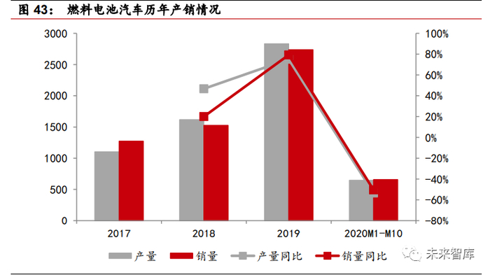 国内起步较晚,但增速较快。从全球范围来看,燃料电池已有百多年发展历史, 国内研究始于 60 年代,处于产业发展初期,整体技术与国际先进水平相比仍 有一定差距。2016-2019 年国内燃料电池汽车销量 CAGR 达到 63%,2020 年 1-10月燃料电池产销分别完成647和658辆,同比分别下降53.5%和50.4%,主要是由于疫情以及政策不确定性所致。