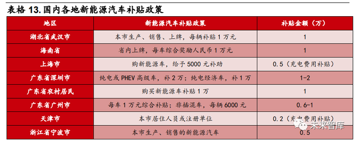 地方消费端补贴加码,新能源汽车销量有望回暖。今年以来,各地也纷纷加大对新能源汽车的补助。深圳市对消费者购买纯电动或 PHEV 高级车给予 2 万元 补助,对于购买纯电动经济车补助 1 万元。武汉、海南分别给予 1 万元的新能 源汽车购置补贴。上海和天津针对新能源汽车充电分别给予 5000 元和 2000 元 的充电费用补助。国家购置税补贴叠加地方政府补贴将进一步降低消费者的成 本,有望推动新能源汽车销量回暖。