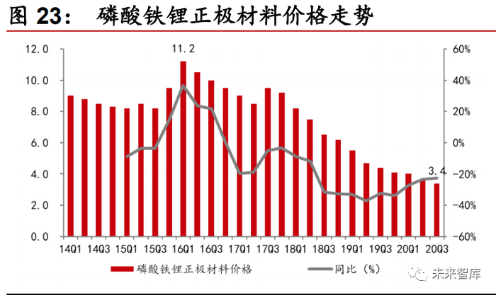 成本下降,磷酸铁锂重获青睐。磷酸铁锂正极材料的成本构成中直接材料约占 75%左右,制造费用占 20%左右,因此其成本下降主要来源于原材料价格下降。上游原材料碳酸锂的价格自 2016 年来大幅下降,且磷酸铁锂正极材料供给过 剩,导致磷酸铁锂正极材料自 16Q1 最高的 11.2 万元/吨下降至 20Q3 的 3.4 万 元/吨,降幅达 69.64%。随着全国新能源汽车补贴下滑,深圳市更是取消补贴, 电动汽车平价化对电池的成本要求极高,导致车企不得不选择更廉价的电池, 磷酸铁锂电池价格比目前广泛使用的三元电池价格低 10%以上,且上游原材料 供给充足预计会继续带来成本下降,叠加磷酸铁锂电池的安全性、可靠性以及 其在能量密度上的突破,长期看磷酸铁锂电池有广阔的发展前景