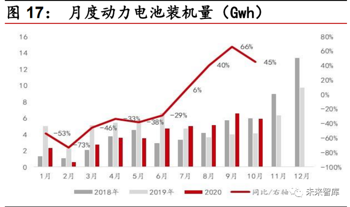 低端车出货量增加,单车带电量下滑。截至 10 月,新能源汽车销量、动力电 池装机量同比分别下滑 7.1%、13.6%。动力电池装机量下滑幅度大于新能源 汽车销量的主要原因是五菱宏光 MINIEV 等低端车出货量增加,导致单车动力 电池装机量下滑。