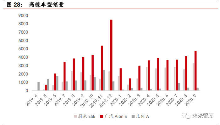 高镍趋势来临,受益终端车型放量。蔚来 ES6 是搭载高镍电池的国内车型, 销量节节攀升;广汽 Aion S 在去年 5 月份正式上市以后,销量逐步从数百辆 攀升至年末的单月 8460 辆,逐步获得消费者认可,成为爆款车型。虽然在今 年前两月,各类车型的销量均受到冲击,但是自 3 月以来,各类车型销量均恢 复正常并且与去年同期相比有小幅增加。伴随着政策的支持,我们预测 2020 年高镍电池以及材料将依旧呈现高增速。