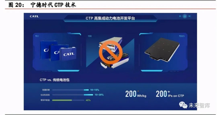2)CTP(cell to pack)系统集成技术,提升 pack 效率。2019 年 9 月,在法 兰克福国际车展上,宁德时代推出了全新的 CTP 高集成动力电池开发平台,即 电芯直接集成到电池包。由于省去了电池模组组装的环节,相对于传统的电池 包,CTP 电池包体积利用率提高了 15%~20%,电池包零部件数量减少了 40%,生 产效率提升了 50%,将大幅降低动力电池的制造成本。CTP 电池包能量密度较 传统电池包将提升了 10%~15%。由于 CTP 是平台化技术,对电芯一致性的要求 相对较高,现阶段各大电池企业都已经开始向该方向进军,而磷酸铁锂电池也 将受益于该技术,提升 pack 效率。