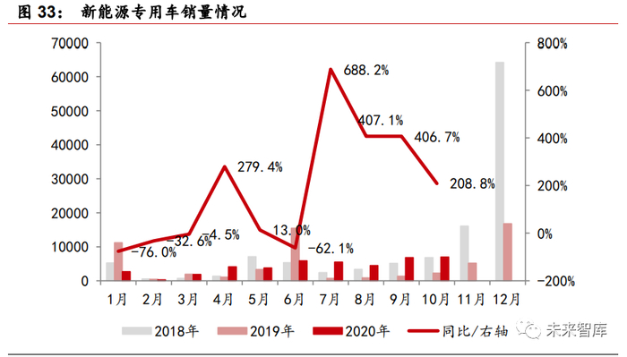 疫情致使新能源汽车产销大幅回落,B 端需求带动销量增长。受疫情影响,今 年 1-5 月国内新能源汽车完成销量 28.9 万辆,同比下滑近 40%,今年国内电 动汽车产销的压力和动力与去年相比结构上发生了变化。上半年由于疫情的影 响,网约车承受较大压力,而环卫、物流、公务、出租等 B 端需求显著提升电 动汽车采购量,1-10 月新能源专用车实现销量 42424 辆,同比增长 9%,表现 优于新能源汽车,且专用车销量已经连续 4 个月同比增长 200%以上,从而对 今年经济压力带来的影响起到对冲作用。