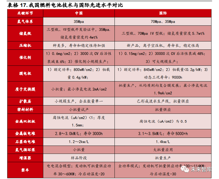 国内产业链布局完善,但技术与国际一流水平仍有差距。本土企业已布局电堆、 膜电极、系统集成与制氢储氢等关键环节,其中电堆与系统通过引入外资技术, 国产化程度已分别超过 50%/70%,在政策支撑下追赶国外水平,但整体性能 参数与国际先进水平仍有差距。